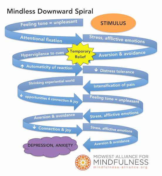 In Mindfulness Based Cognitive Therapy (MBCT) we learn about the “downward spiral” – when we are operating on autopilot, we are vulnerable to being caught up in a self-perpetuating cycle of reactivity that, for some people, can lead to depression and anxiety. The more times we go around in this cycle the more deeply ingrained, reflexive and rapid it becomes – a recipe for relapse.